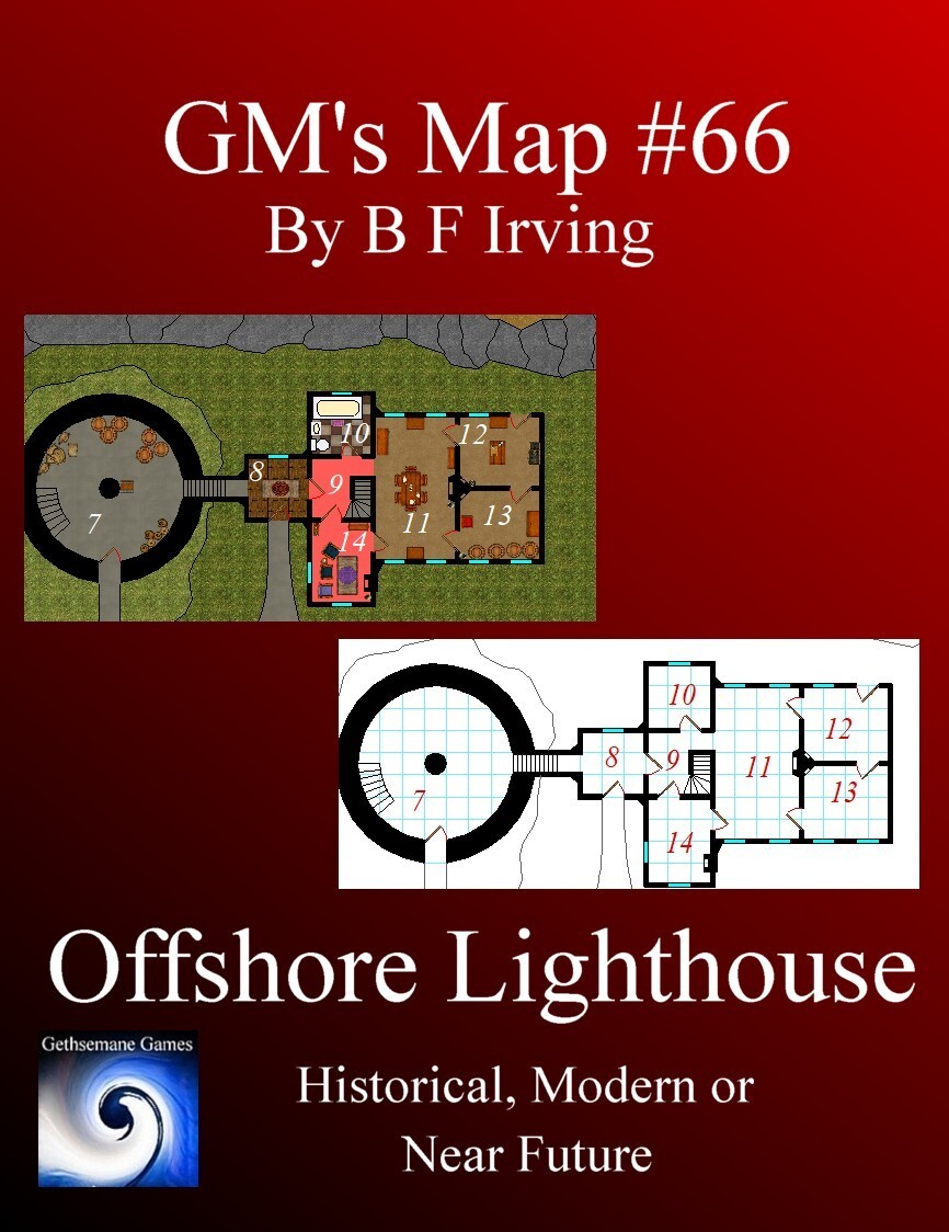 Find out with GM's map #66 by Gethsemane Games. Complete with both a full colour and a blueprint style version of the map in JPG, and PNG, a PDF containing notes about lighthouses and their history, adventure hooks and a key for the map provided.