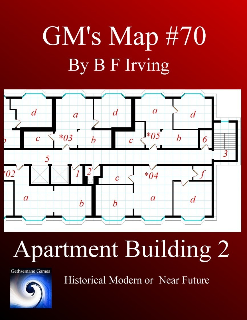 GM's Map #70 depicts a moderate apartment building, suitable for low to middle-income tenants depending on how well appointed and maintained they are. In addition to the maps themselves which are presented as JPEG and PNG options both with and without a square grid the product also includes a PDF with information about apartment buildings, a key to the map and 9 adventure hooks or ideas that you can develop into fully fledged adventures (or of course, write your own).